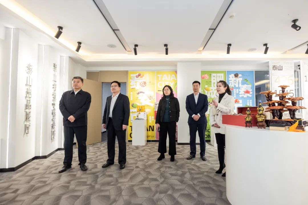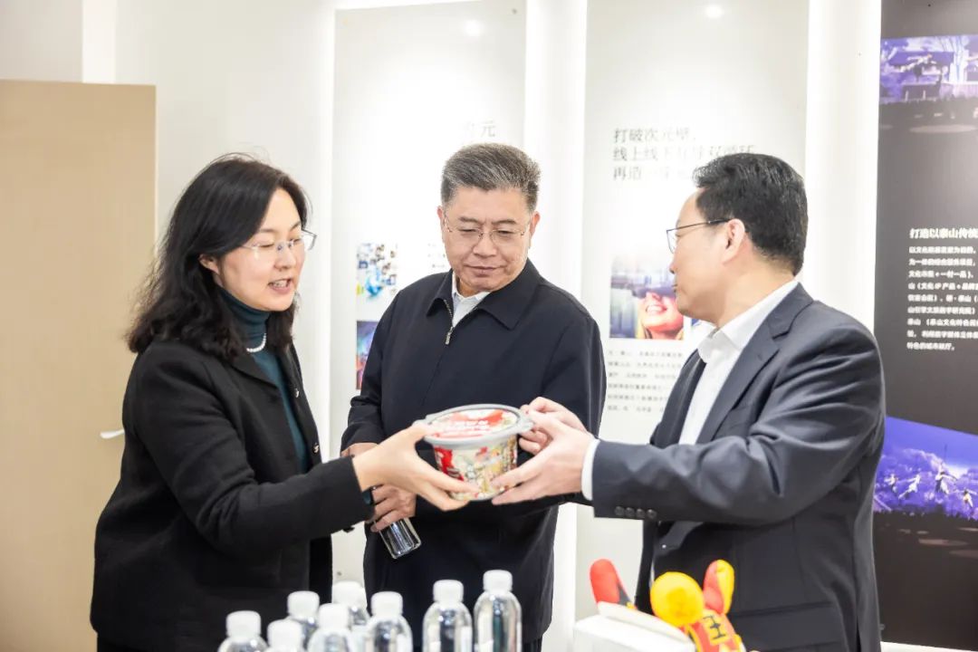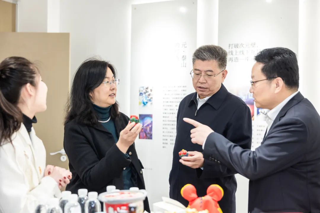 郭德文一行對智慧文旅基地、電商直播間、文創(chuàng)研發(fā)中心等區(qū)域進(jìn)行了實(shí)地參觀。并現(xiàn)場聽取工作人員對以泰山IP為核心的“泰山出品文創(chuàng)系列”、“元泰山數(shù)字科技”、“朝山歸文旅品牌”以及“泰山產(chǎn)品供應(yīng)鏈”等業(yè)務(wù)的詳細(xì)介紹。
