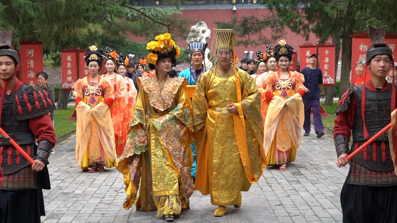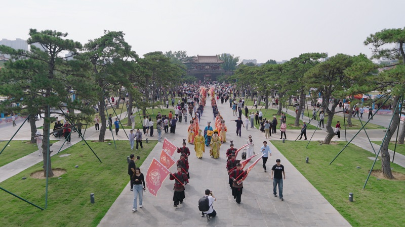 本次文化旅游節(jié)活動自10月1日持續(xù)至10月5日,活動期間設(shè)置了主題鮮明、層次豐富的特色內(nèi)容。每日10時,來自中華泰山·封禪大典的演藝團隊以《萬國來朝·盛世啟市》主題演出拉開序幕。天鼓初鳴之際,悠遠號角與鏗鏘鼓點交織共鳴,依次呈現(xiàn)開場迎賓禮、司禮官肅穆登場、舞姬書生伴唐宮人物(李治、武則天)盛裝巡游。巡游結(jié)束后,演員們將化身隱藏NPC,身著唐宮華服扮演“帝王”“貴妃”等角色,與游客展開對詩猜謎、合影互動等環(huán)節(jié)